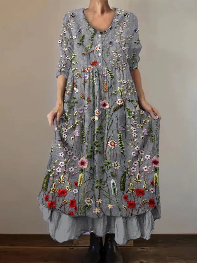 Women's Vintage Botanical Double Layer Button Dress